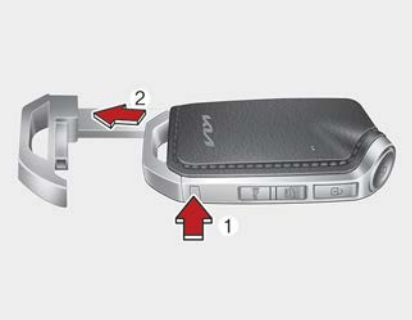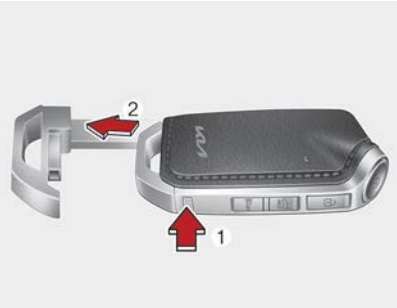 1. 키 고정 버튼(1)을 누른 상태에서 비상키(2)를 잡아당겨 분리합니다.